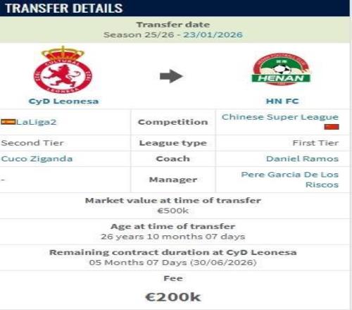 德轉(zhuǎn)顯示,西乙萊昂文體邊鋒姆布拉加盟河南隊(duì)的轉(zhuǎn)會(huì)費(fèi)為20萬歐。