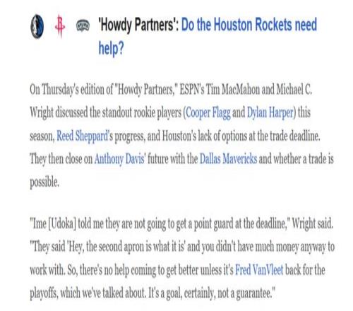 盡管烏度卡親承球隊(duì)不會(huì)在交易截止日前引進(jìn)控衛(wèi),但這并不意味著,火箭隊(duì)真的一定不會(huì)有引援動(dòng)作發(fā)生。